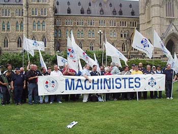 The Machinist’s Union and your Local Lodge joined thousands of demonstrators on Parliament Hill to protest the loss of 33,000 manufacturing sector jobs in Quebec between January and February 2007. This slaughter adds to the 100,000 manufacturing sector jobs already lost since November 2002; making Quebec the most affected by the job losses in Canada. (For all of Canada, there were around 270,000 jobs lost.) The demonstrators also protested the Government’s inertia; they have taken no measures against this major crisis. These are jobs with average salaries of $20.68 hourly which are disappearing, contributing to the general impoverishment of the economy.